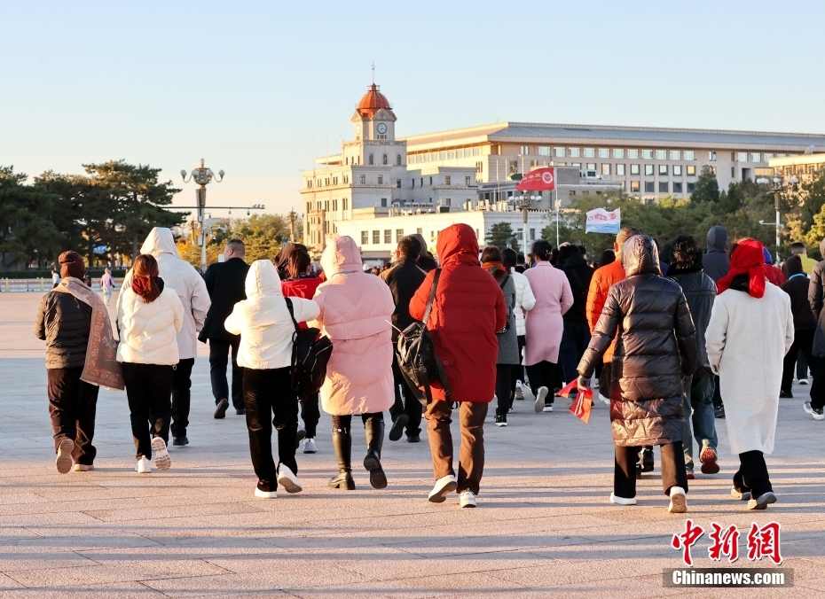 11月4日,受冷空气影响,北京迎来大风降温天气。图为寒风中游客“全副武装”游览天安门广场。