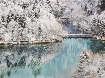 2025年1月20日,中外游客在四川九寨沟景区五花海游览。人民日报记者 宋豪新摄