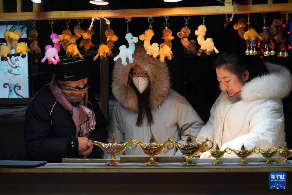 1月21日,在甘肃省敦煌市的敦煌夜市,游客选购纪念品。