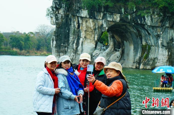 1月22日,桂林市区小雪,桂林城徽象鼻山,游客纷纷拿出手机合影。