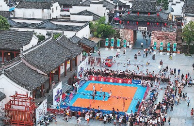近年来,安徽歙县持续丰富体育旅游产品和服务供给,激发体育旅游消费,促进“文化+旅游+体育”高质量发展。图为参赛选手在徽州古城篮球争霸赛中竞技。