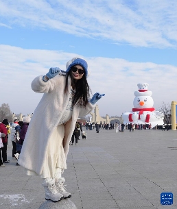 12月9日,游客在哈尔滨太阳岛风景区正门广场与大雪人合影。
