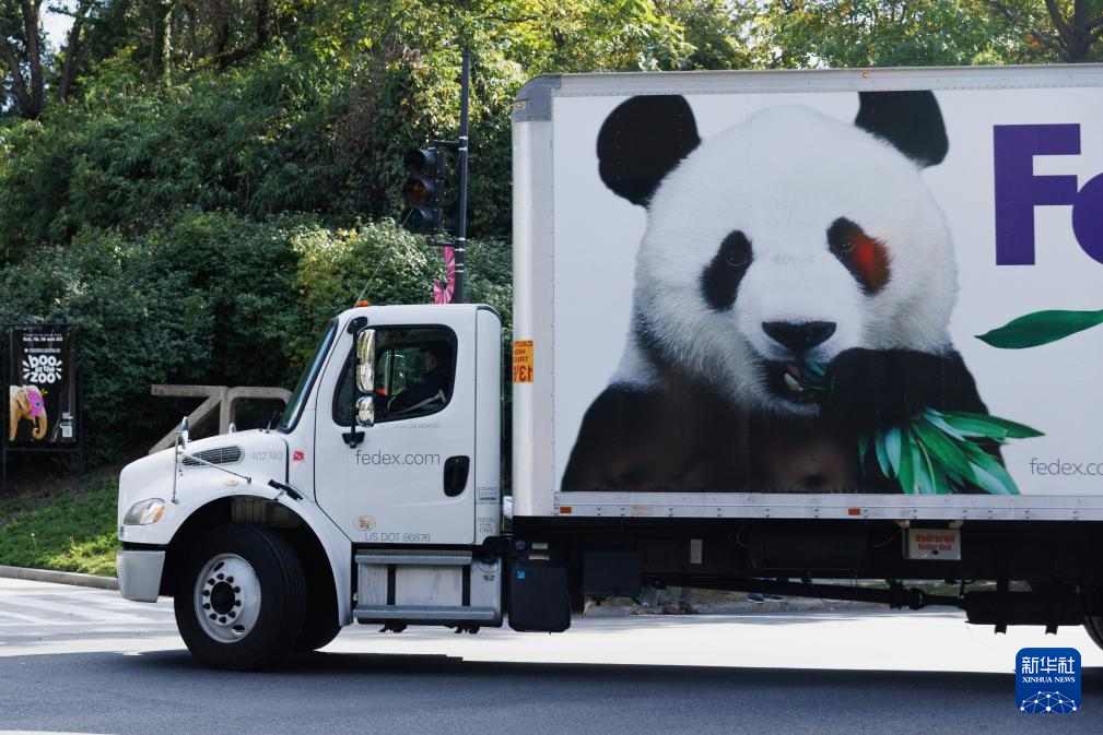 10月15日,在美国首都华盛顿 ,运送大熊猫的卡车即将驶入华盛顿国家动物园。当日,大熊猫“宝力”和“青宝”抵达美国华盛顿国家动物园,开启为期10年的旅居生活。