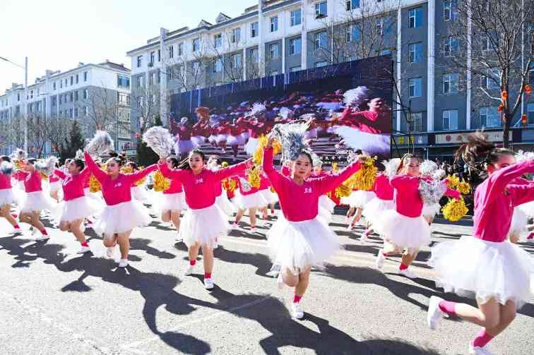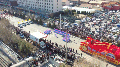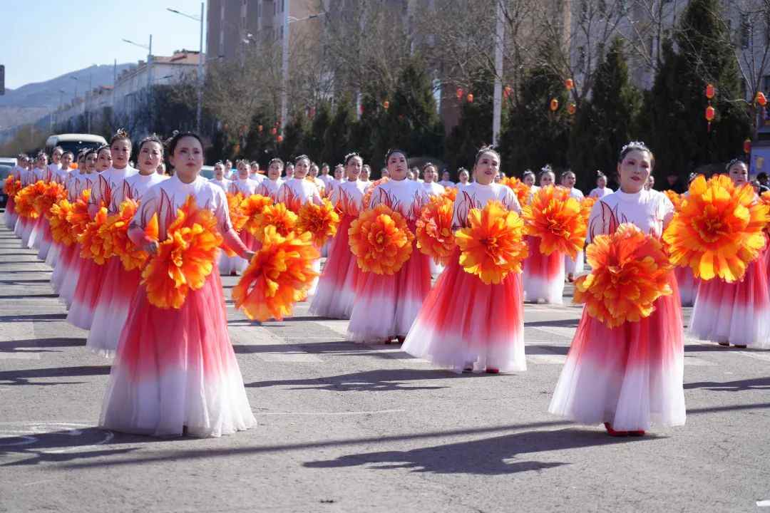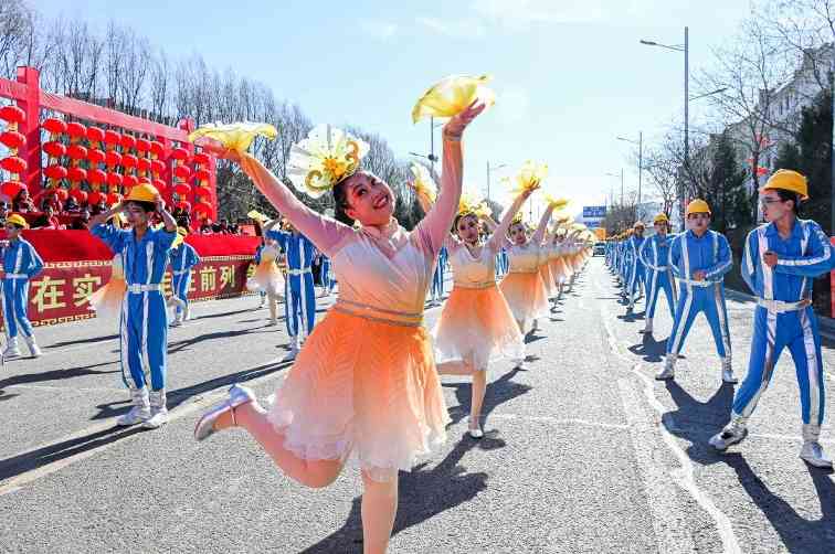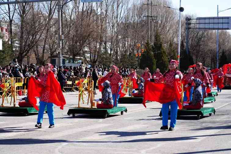 上午十点整,在喧天的锣鼓声中,文艺游行活动正式拉开帷幕。来自全县各乡镇(城区)的9路队伍,与各系统的11路队伍从太和路出发,途经永和路,在北内环开展游行活动,为沿路的群众送上新春祝福。演员们精心打扮、身着鲜艳的服饰,伴着欢快的鼓点,一路欢歌而来。舞蹈、歌曲、情景演绎、英歌舞等传统社火项目轮番上演,每一支队伍都身着节日盛装,以饱满的精神状态投入到表演中。锣鼓阵阵、狮舞翩跹,欢快的节奏、优美的舞姿,原汁原味的表演瞬间把喜气洋洋的气氛传递给了在场所有的观众,人人拍手叫好,现场一派热闹景象。