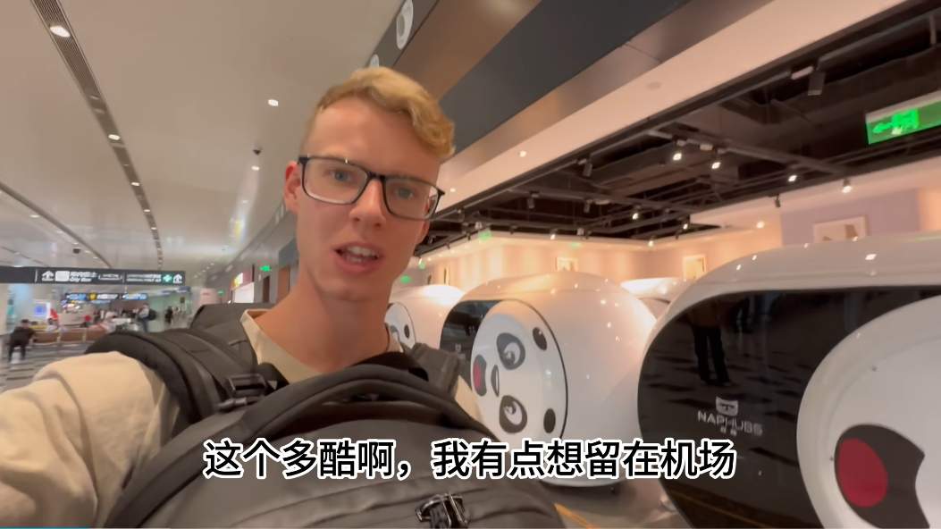 外国游客打卡机场睡眠舱。