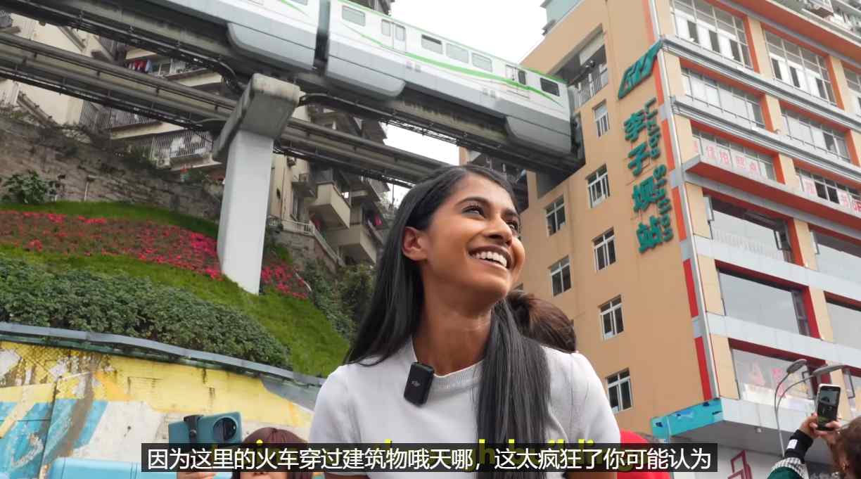 外国游客被重庆李子坝轻轨穿楼所震撼。