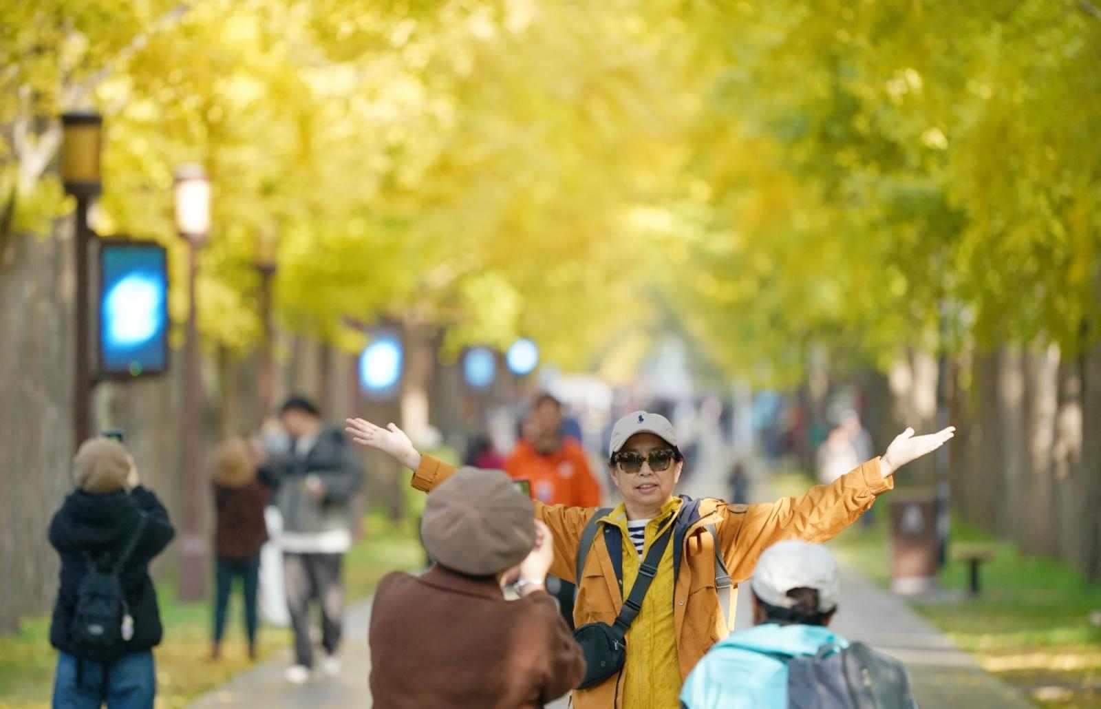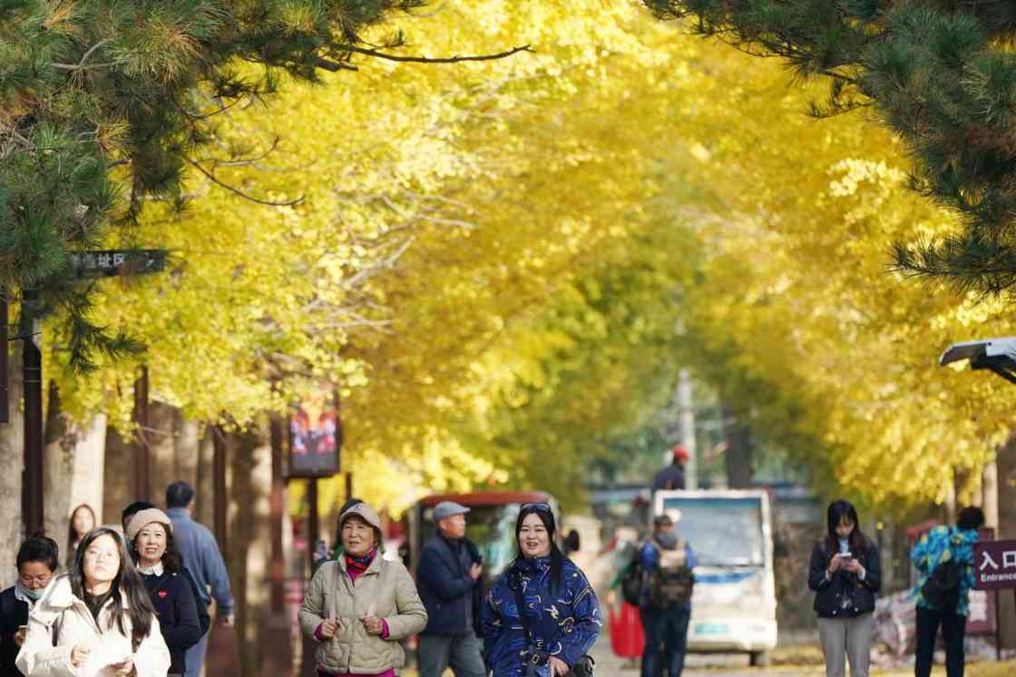 道路两边每隔三五米就有一棵银杏树,上百棵近20米高的银杏树挺拔屹立,数不清的银杏叶如千万把金色扇子,在秋日的阳光下熠熠生辉。纷至沓来的游客或穿行散步、或驻足拍照,享受着难得的愉悦与惬意。从春夏的翠绿到秋天的金黄,圆明园的银杏大道见证了时间的更迭,也为市民游客提供了一年又一年的自然美景。