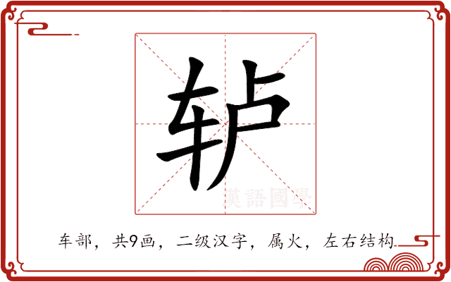 轳,通用规范汉字,二级汉字,序号4180,拼音是(lú),车部,共9画,形声字,左右结构,五行属火。