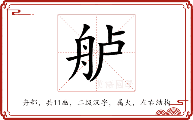 舻,通用规范汉字,二级汉字,序号4916,拼音是(lú),舟部,共11画,形声字,左右结构,五行属火。