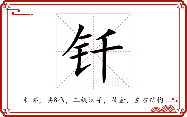 钎,通用规范汉字,二级汉字,序号3940,拼音是(qiān),钅部,共8画,形声字,左右结构,五行属金。