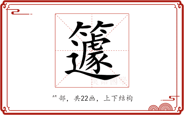 籧,位于中日韩统一表意文字 (基本汉字),Unihan编码U+7C67,拼音是(qú),⺮部,共22画,上下结构。
