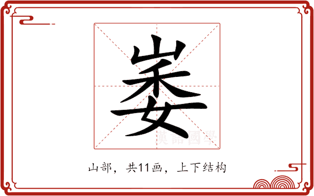 崣,位于中日韩统一表意文字 (基本汉字),Unihan编码U+5D23,拼音是(wěi),山部,共11画,上下结构。