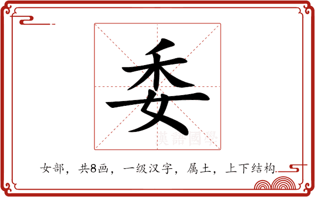 委,通用规范汉字,一级汉字,序号1133,多音字,拼音是(wěi 或 wēi),女部,共8画,会意字,上下结构,五行属土。