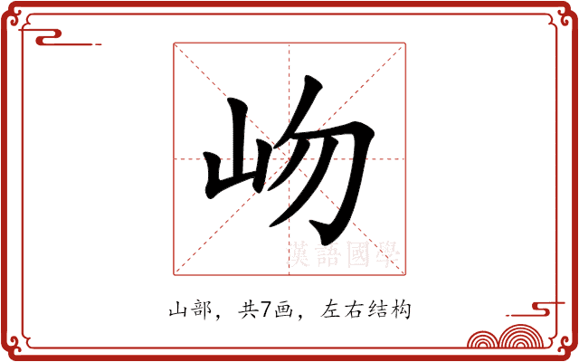 岉,位于中日韩统一表意文字 (基本汉字),Unihan编码U+5C89,拼音是(wù),山部,共7画,左右结构。