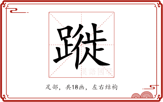 蹝,位于中日韩统一表意文字 (基本汉字),Unihan编码U+8E5D,拼音是(xǐ),足部,共18画,左右结构。