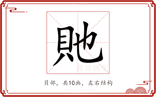貤,位于中日韩统一表意文字 (基本汉字),Unihan编码U+8CA4,多音字,拼音是(yì 或 yí),貝部,共10画,左右结构。